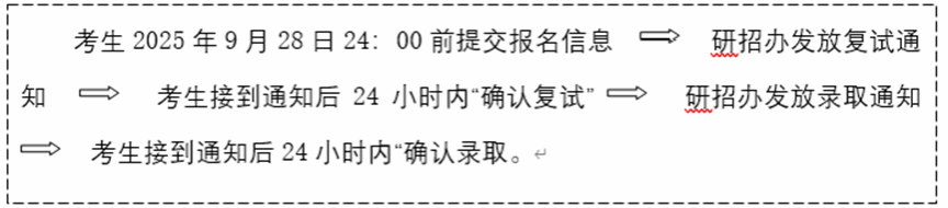 5.获得拟录取资格的申请人务必于2025年9月28日24:00前(预计时间,具体时间另行通知)登陆教育部“全国推免生服务系统”填写提交报名信息,并按照如下程序完成录取确认,逾期未确认将视为自动放弃录取资格。