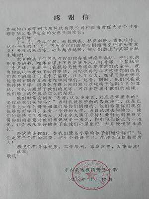 本次“壹拾佰仟”大型公益志愿活动的开展不仅带给了山区孩子们关心与关怀,也以实际行动激励着更多西财学子参与进来,共同传递爱与温暖,践行“大气为人、大智谋事、大爱行天下”的西财青年品格。展望未来,公益志愿活动大有可为,也大有作为,太阳成集团tyc151cc将持续秉承社会责任感,以实际行动践行公益使命,奋力推进公益志愿事业高质量发展,更好发挥志愿服务的积极作用,让更多的温暖和爱传递给需要帮助的人群!