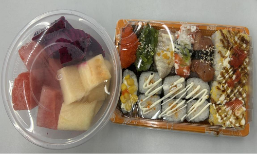 (图为本次午餐会餐食:寿司拼盘和果切)