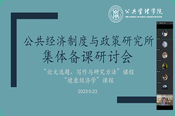 5月23日下午,公司公共经济制度与政策研究所举行了线上集体备课与研讨活动,集体备课的课程为任杨玲老师主讲的硕士研究生课程《论文选题、写作与研究方法》和陈泽媛老师主讲的硕士研究生课程《健康经济学》。系所教师胡务、王霞、黄硕、王一如、刘翔实等参加讨论,所长何欢主持会议。