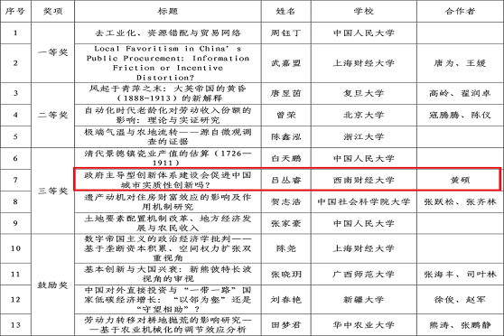 2023年6月29日,中国人民大学经济公司公布第三届“经英杯”全国高校员工经济论坛获奖名单,公司2022级公共经济制度与政策专业博士研究生吕丛睿与导师黄硕副教授合作论文《政府主导型创新体系建设会促进中国城市实质性创新吗?》荣获研究生组三等奖。