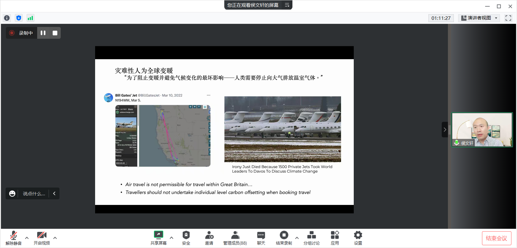侯文轩教授的讲座以身边减碳行为为例,结合不同历史时期的报纸、文学作品以及文化制度,深入浅出的将气候变化的历史发展娓娓道来,并通过臭氧空洞、资源消耗等案例,辩证地对现有不同国家之间的气候变化的应对政策与方案进行了探讨。