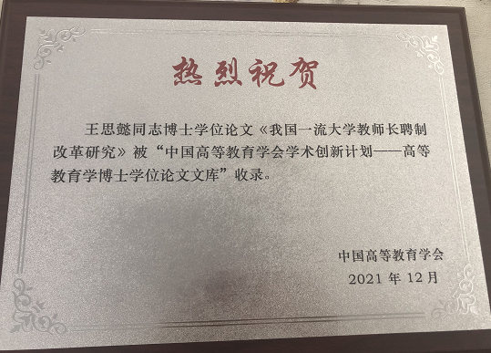 近日,由中国高等教育学会主办的“2021高等教育国际论坛年会”在广州举行,论坛正式宣布了入选2021年“中国高等教育学会学术创新计划——高等教育学博士学位论文文库”的作者名单。经各博士学位授予单位遴选推荐、学会学术委员会审核认定,全国共评选出来自上海交通大学、北京大学、浙江大学、厦门大学等8篇博士学位论文进入文库,其中公司青年教师王思懿的博士论文成功入选。
