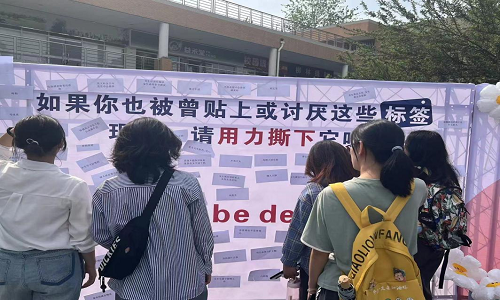 本次活动精心设计了贴满各式各样标签的展板,标签代表着每个人被加诸于身的种种限制和刻板印象。活动邀请同学们认真思考自我特点,从展板上撕下代表自己负面标签的纸片,并用正能量的话语取而代之,鼓励同学们认识并接受自己的独特性,挑战束缚,发现更加多元的自我。除了撕标签之外,同学们还可以用彩笔绘制属于自己的“真我之花”,用颜色和形状来表达自己的个性和情感,让参与同学在轻松愉快的氛围中深入探索内心世界。