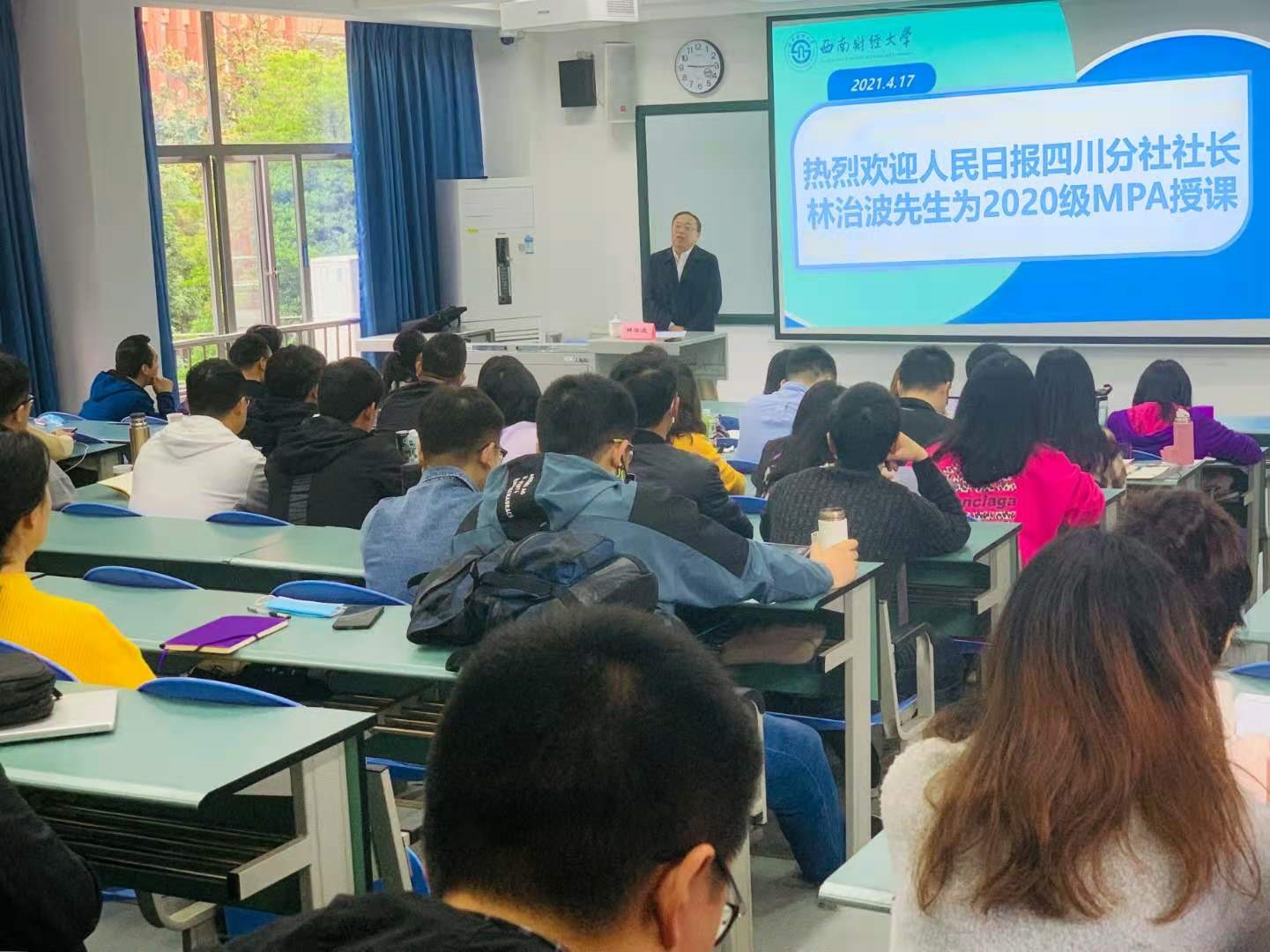 2021年4月17日上午,人民日报社四川分社社长林志波教授在明德楼212为2020级MPA员工做了主题为“从党史的学习中确立精神信仰,汲取前进力量”的专题讲座。讲座由太阳成集团tyc151cc副经理、MPA教育中心副主任顾绚主持。
