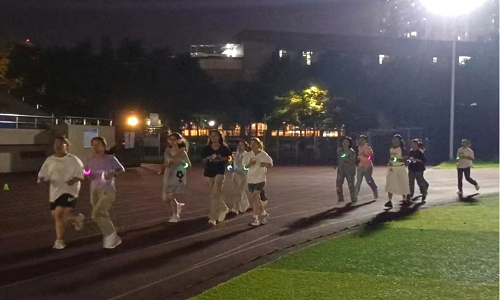 活动当晚,操场上人头攒动,同学们身着荧光装备,手戴荧光环,脸上洋溢着期待与喜悦的笑容。主持人在带领大家进行充分的热身运动后,随着一声清脆的哨声响起,“荧光夜跑”活动正式启动。同学们或独自疾驰,或结伴而行,彼此间相互激励,共同前行,以实际行动践行了“健康至上”的生活理念,展现了当代青年学子的蓬勃朝气与青春活力。