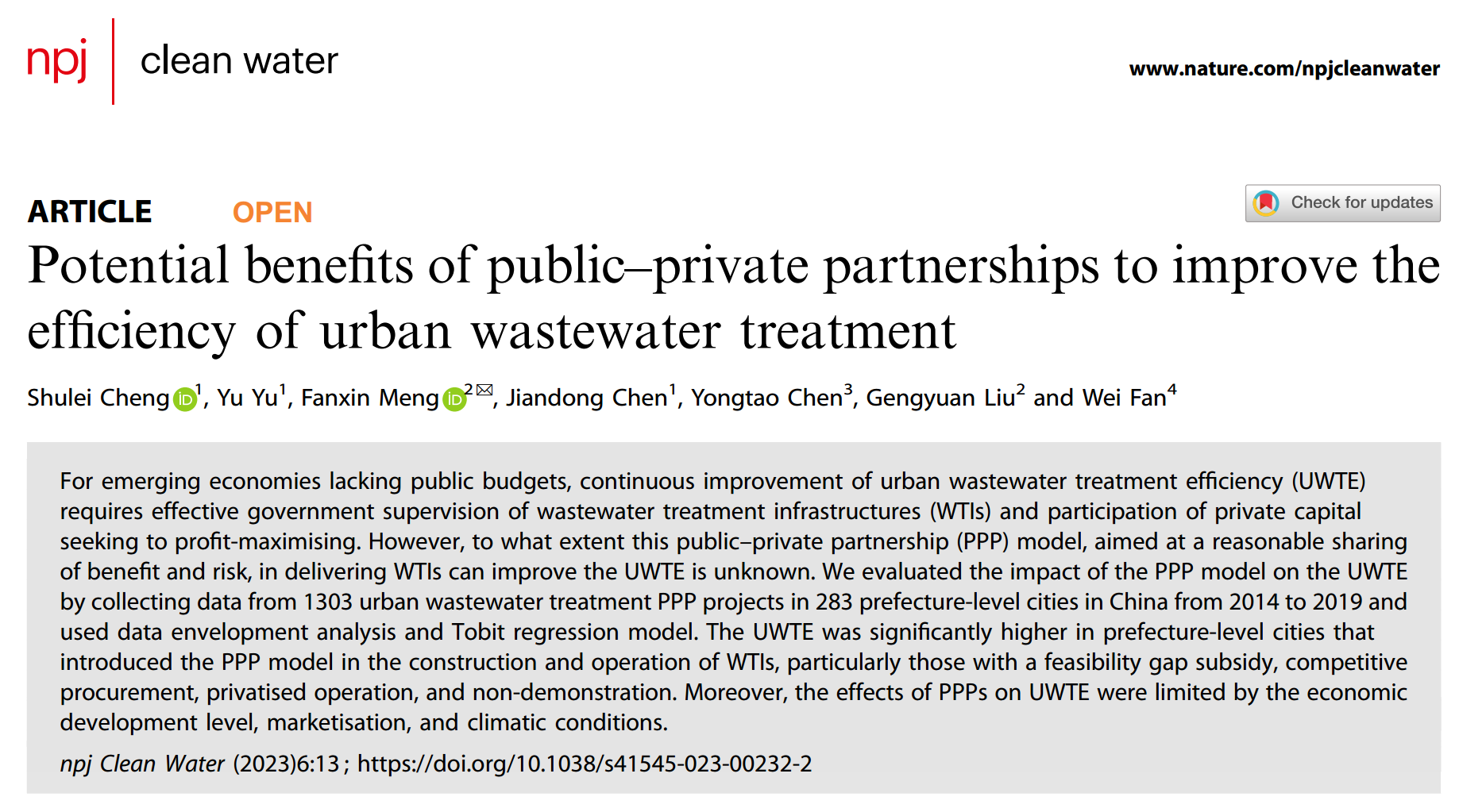 近日,太阳成集团tyc151cc程树磊教授等在Nature旗下期刊《npj Clean Water》发表了题为《Potential benefits of public-private partnerships to improve the efficiency of urban wastewater treatment》(《政府与社会资本合作对提升城市污水处理效率的潜在作用》)的研究论文,并受自然出版集团的邀请在Nature Blog撰写研究背后的思考与故事。