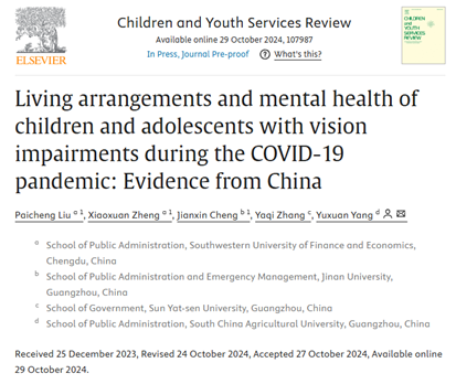 近日,公司行政管理系讲师刘派诚领衔的研究团队在国际期刊Children and Youth Services Review发表了题为Living arrangements and mental health of children and adolescents with vision impairments during the COVID-19 pandemic: Evidence from China的论文。作者团队包括2020级行政管理专业本科生郑晓翾(现为湖南省选调生)、暨南大学程建新副教授、2020级行政管理专业本科生张雅琦(现为中山大学政治与公共事务管理公司硕士研究生)和华南农业大学杨雨萱副教授(通讯作者)。