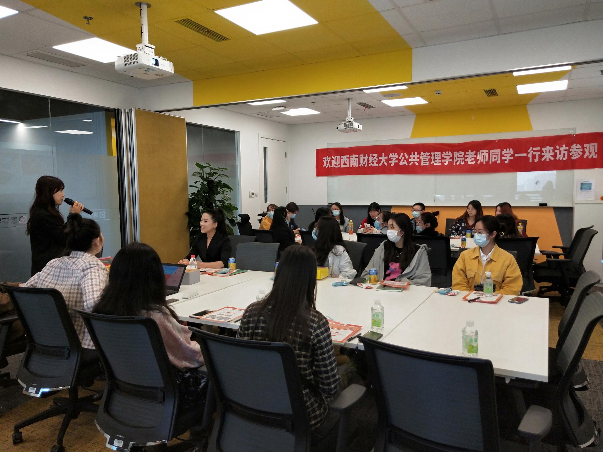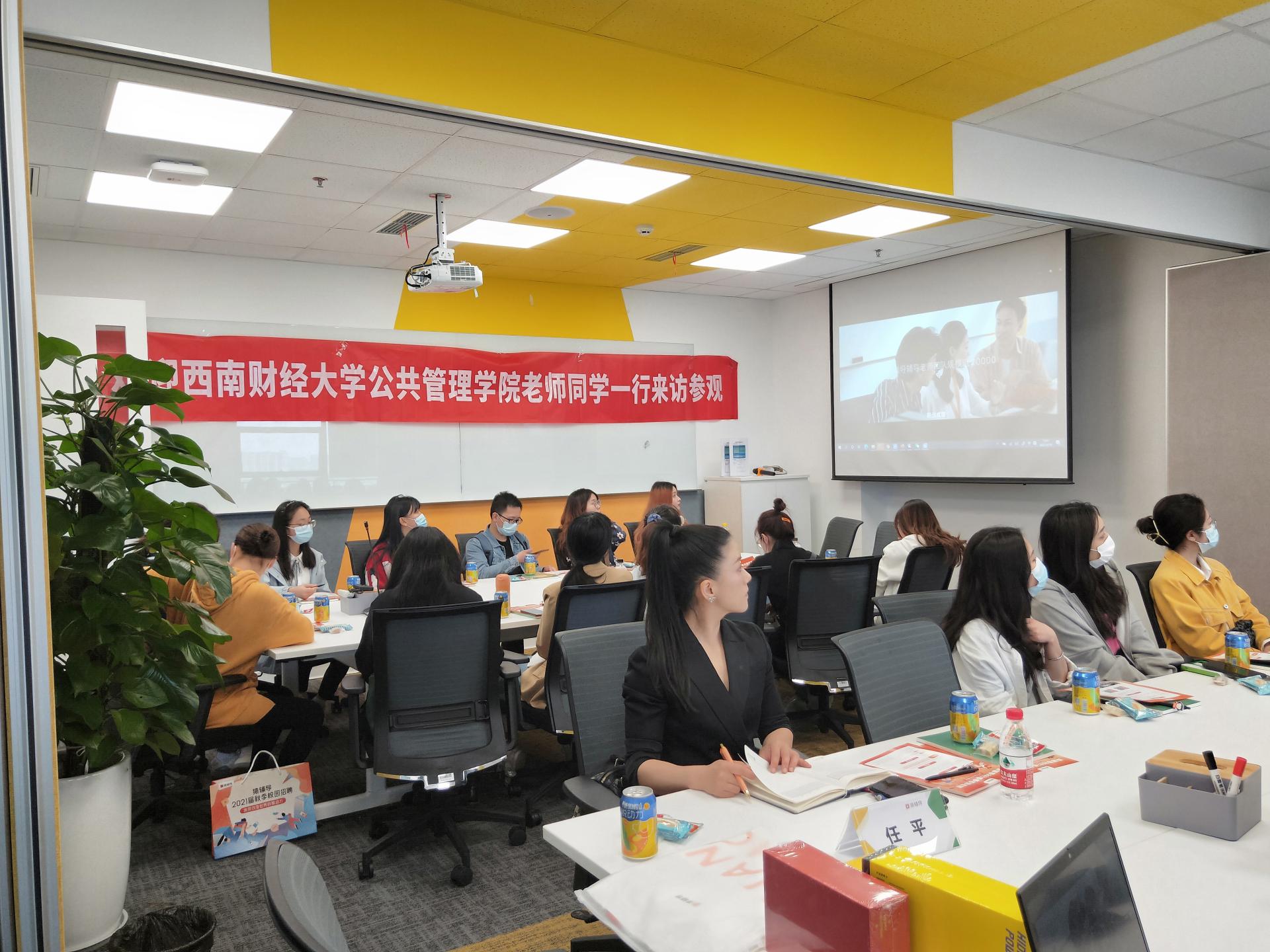 按照活动安排,通过企业参观体验、HR座谈分享以及问题交流互动三个环节开展当天的活动。企业实地参观,让同学们对猿辅导的企业文化、办公环境、工作氛围、运行模式有大致的了解。随后,猿辅导成都分公司负责公司招聘的HR团队在会议室与到访师生展开座谈,介绍在线教育行业情况、猿辅导的发展历程及现状,以及公司岗位需求。