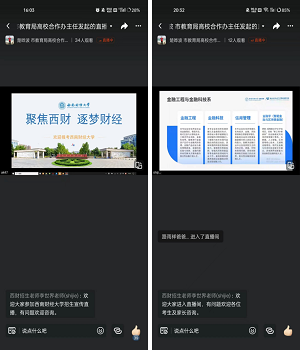 2023年12月30日,杨帆以“聚焦西财 筑梦财经”为主题面向大同市12所优质高中开展直播讲座,主要对公司的历史沿革、办学实力、人才培养模式以及最新的招生政策展开重点介绍。李世界作为场外支持,积极与考生和家长进行线上互动,在线解答各类问题咨询。