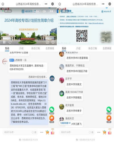 2024年4月14日,就广大考生关注有关公司办学特色及专项招生的问题,李世界通过线上直播的形式对公司发展历史、办学特色以及“2024年高校专项计划招生简章”等内容进行了详细介绍。期间在线回答考生及家长相关咨询,并对公司2024年山西省招生咨询群进行宣传。此次直播,吸引近200位考生及家长参与。