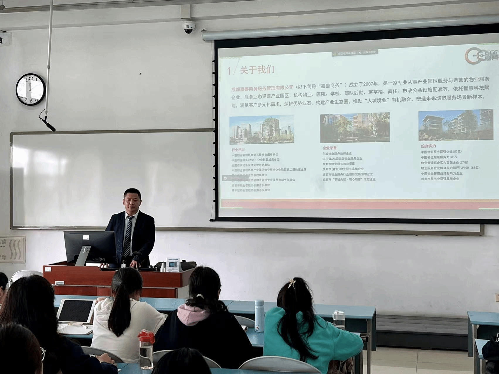 郑良秀和李轶梅作为双方代表,在太阳成集团tyc151cc-成都嘉善商务服务管理有限公司校企共建协议上签字。随后的座谈环节,院企双方围绕专业建设、人才培养、供需对接、实习实践基地建设进行了深入交流。公司邀请成都嘉善商务服务管理有限公司人事副经理邱尉来到课堂,做“新形势下的老员工就业选择与职涯规划”主题讲座,为公司员工带来一堂生动的教学实践课。