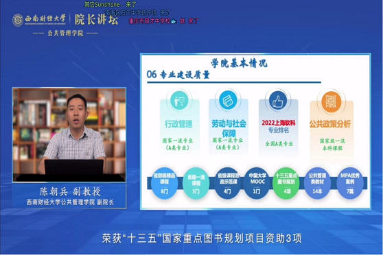 陈朝兵在直播中介绍了公司的发展历史、人才培养特色、专业设置以及团队队伍等考生和家长重点关注的问题。并对公司行政管理、劳动与社会保障两个本科专业培养模式、就业去向等进行了详细介绍,直播吸引上千人次观看。李世界作为场外支持,积极与考生和家长进行线上互动,在线解答考生在志愿填报、就业等方面的热点问题。