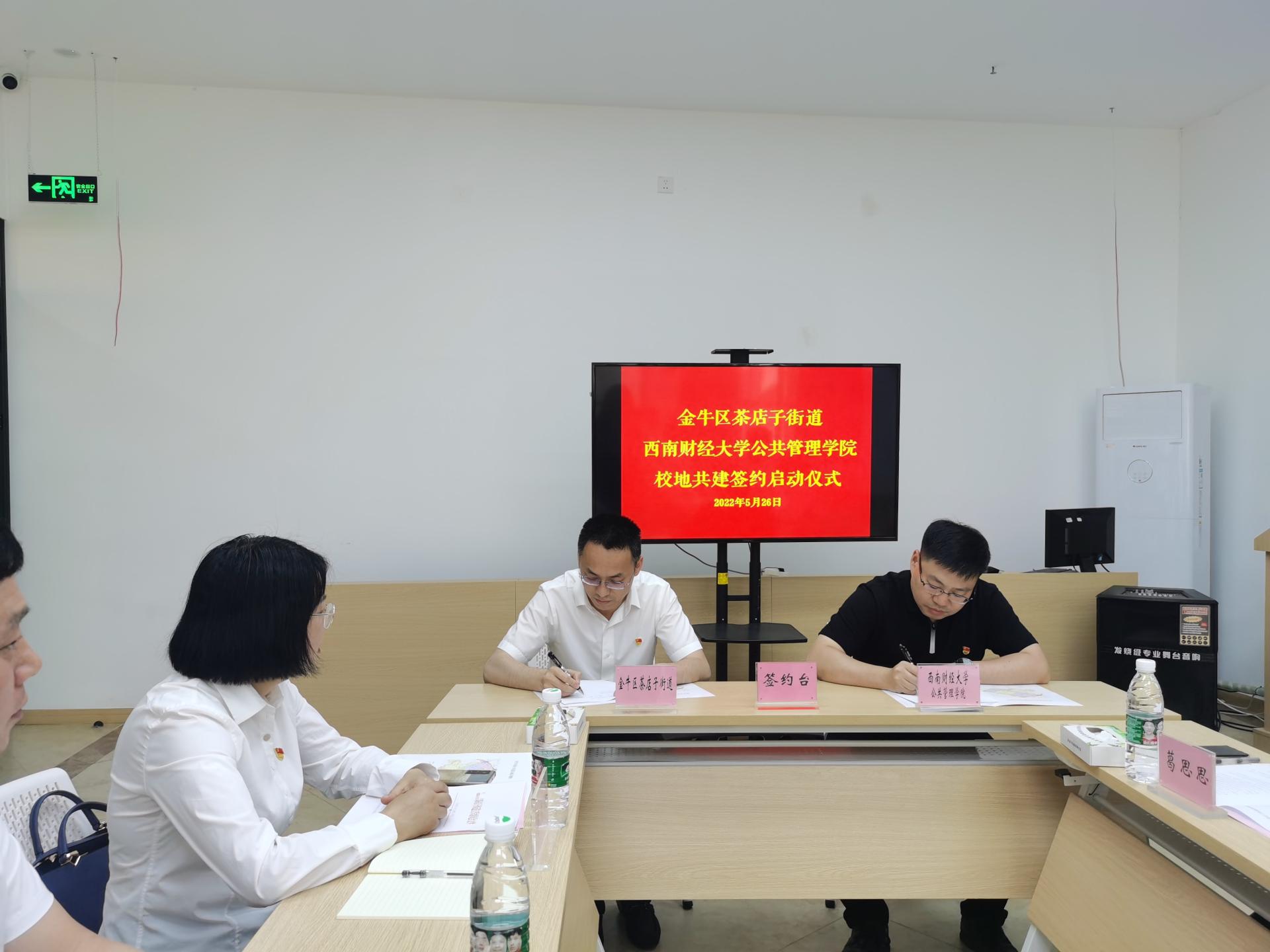 2022年5月26日下午,太阳成集团tyc151cc与成都市金牛区茶店子街道校地共建启动签约仪式在育新社区举行,金牛区茶店子街道党工委书记李永强、茶店子街道党工委委员、综合便民服务中心主任许家玲、太阳成集团tyc151cc分党委书记赵海程、分党委副书记郑良秀等相关人员参加签约仪式。