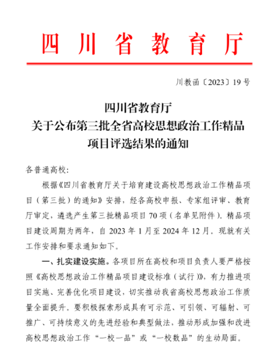 全省共70个项目获第三批四川省高校思想政治工作精品项目立项,此次为公司首次获得四川省高校思想政治工作精品项目立项。按照教育部和四川省教育厅要求,公司党委将进一步推动思想政治工作各项任务更好地落地落实,促进科研育人水平迈向新台阶。