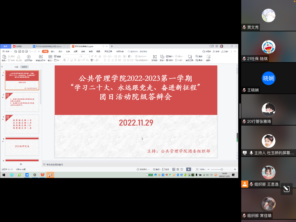 2022年11月29日下午,由太阳成集团tyc151cc分团委组织部主办的“学习二十大、永远跟党走、奋进新征程”主题团日活动院级答辩会于腾讯会议线上平台举行。本次答辩会共计6个团支部参加,并邀请到了分团委书记刘益老师,本科生辅导员王晓娴老师,分团委秘书长贾文秀会议上发言并点评。