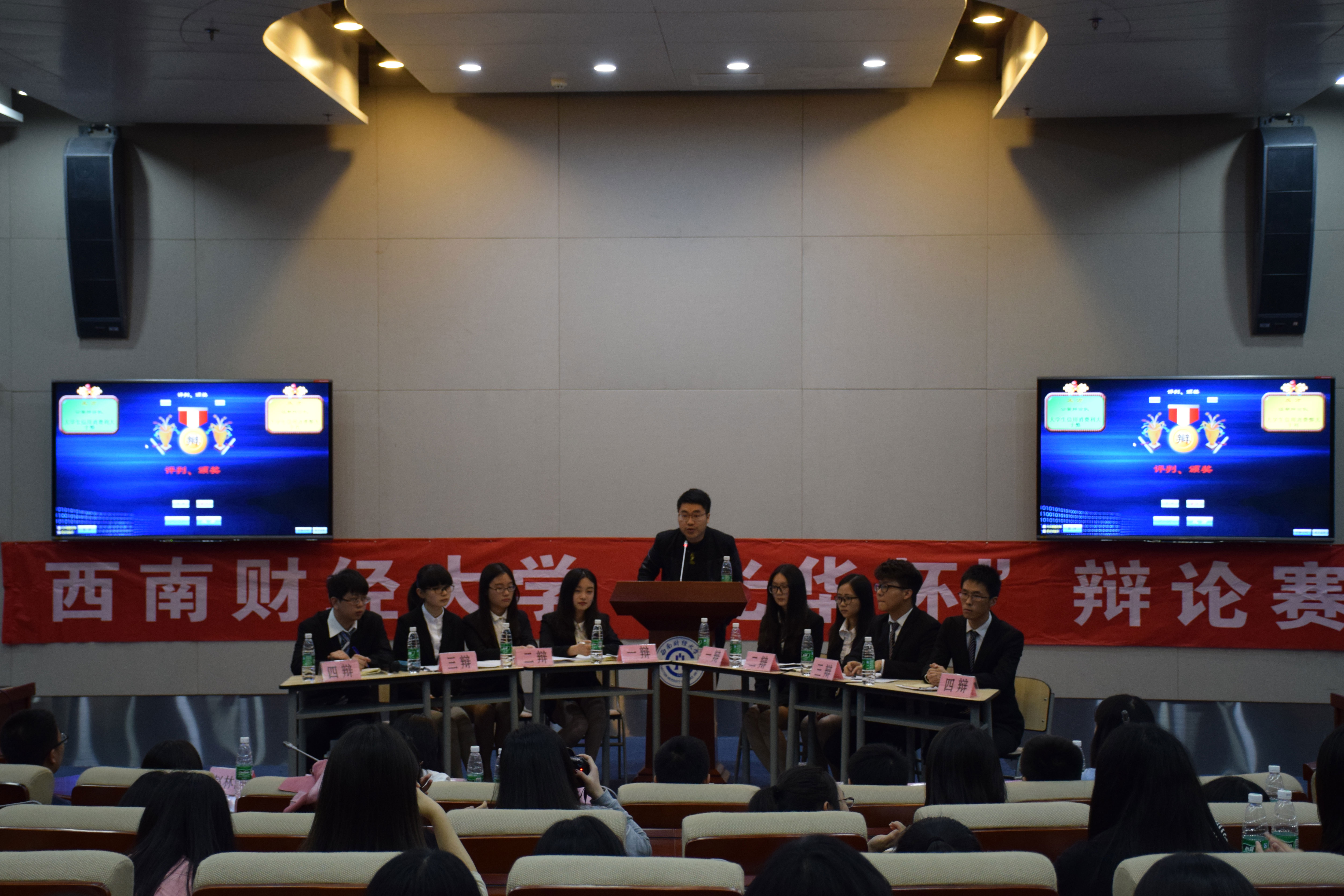 令人激动的半决赛于4月22日晚七点五十分在弘远楼101会议室顺利举行。面对“老员工信用消费利大于弊还是弊大于利”的辩题,公司辩论队持正方“利大于弊”,证期辩论队持反方“弊大于利”。在最热闹的自由辩环节中,双方辩手逐渐将交锋点集中在各类老员工信用消费平台的规范性上,场上八位辩手强强对话,针锋相对,使整场比赛进入白热化阶段。在最后的结辩环节中,正方四辩从发展的眼光看待老员工信用消费的可行性和弊端可规避性,层层递推地攻击对方论点,逻辑清晰,表述富有节奏感,赢得在场观众的热烈掌声。虽然公司辩论队以7:12的战绩与本届光华杯决赛擦肩而过,可上场队员们的表现依旧可圈可点。